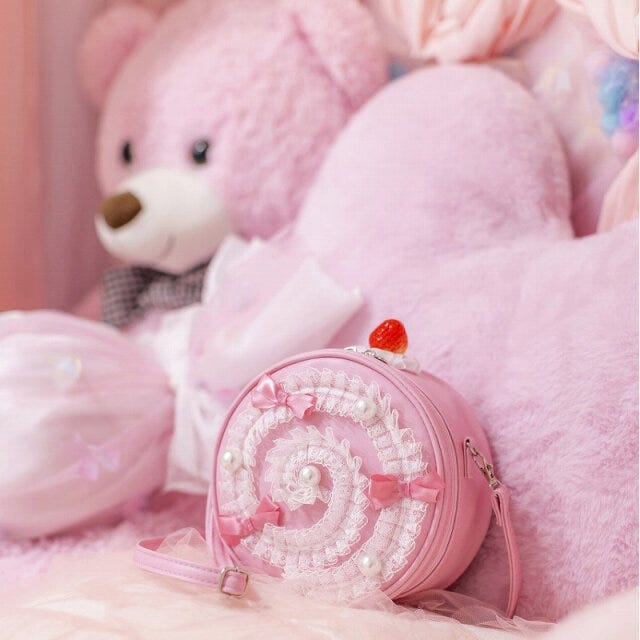 お菓子が大好きなユーチューバーりちちゃんが考えたロールケーキポーチは、レースでクリームを表現、いちごスポンジをイメージしたピンクのデザイン。