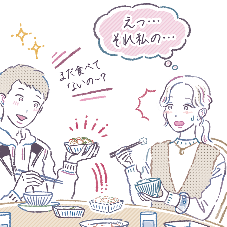 私は味わって食べたいし、会話も楽しみたいからゆっくり自分のペースで食べ進めていたのに、私のお皿を見て