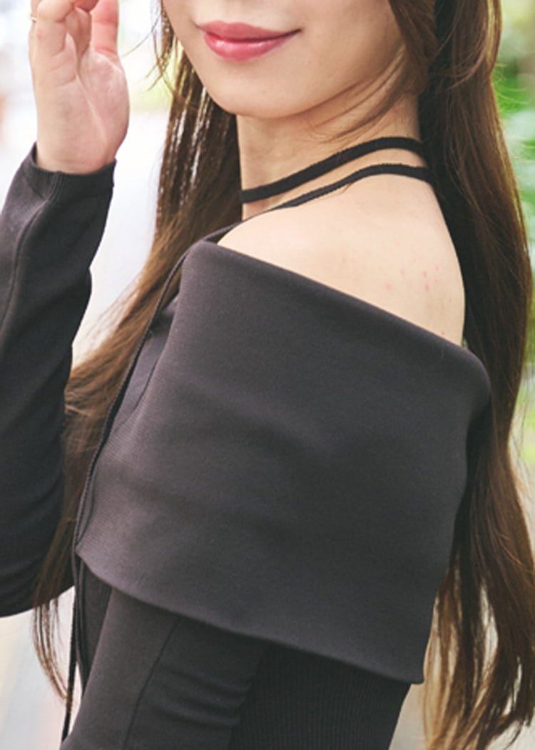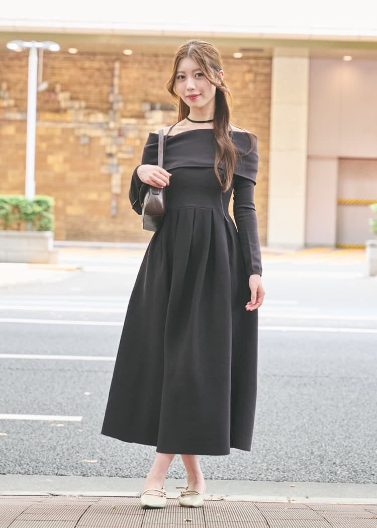 「オフショルワンピはLa luneで約23,000円。大人っぽい黒のロング丈ワンピースに