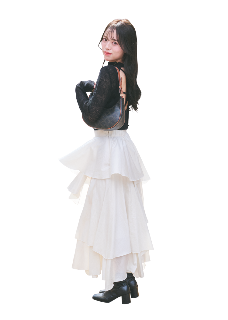 「背中見せが特徴的なトップスはSNIDELで約8,000円。ティアードが可愛いロングスカートはFRAY I.Dで約20,000円。