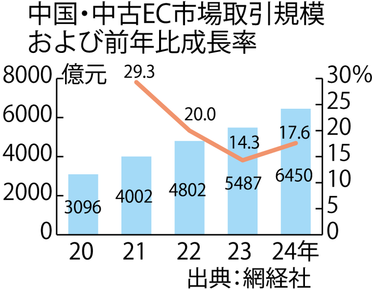 「新しいものを買う前に、何かを捨てないといけない。ただ、捨てるのはもったいない」という人が増え、近年は中古ECが拡大基調。24年の取引規模はユーザー数6億人超、取引金額6450億元(約13兆5000億円)と前年対比17.6%も増えた。若年女性が多く、最新トレンドの投稿が多い「小紅書」(RED)でも、アプリ内に中古品を簡易出品できる機能のトライアルを始めた。以前であれば中古の服や靴の購入は「他人が使った服なんて不衛生だ」「お金のない人が買うもの」という抵抗感があり、売る側も「自分の服を小銭に換えるなんてみっともない」という躊躇(ちゅうちょ)があった。