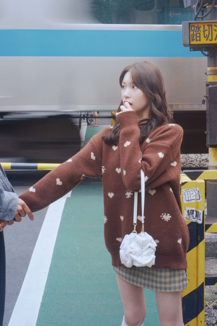 ハート柄ニットは着回し。チェック柄ミニスカート 11,110円/CRANK(HANA SHOWROOM)バッグ 12,100円/RESEXXY ソックス 759円/チュチュアンナ