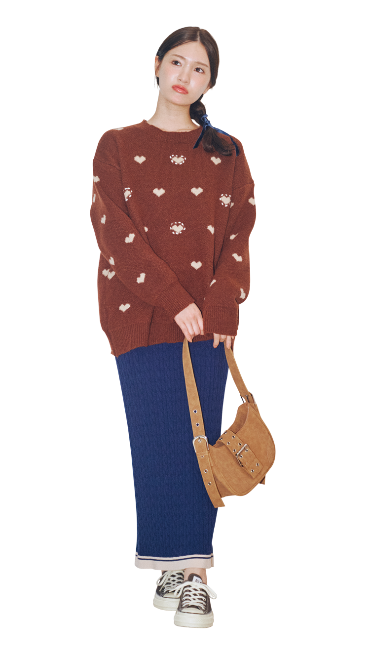 ハート柄ニットをざっくり、ネイビーのリブタイトで縦ライン強調。白スニーカーで軽さを出し、キャメルバッグでやわらかく。甘さは残しつつ、落ち着きもキープ♡