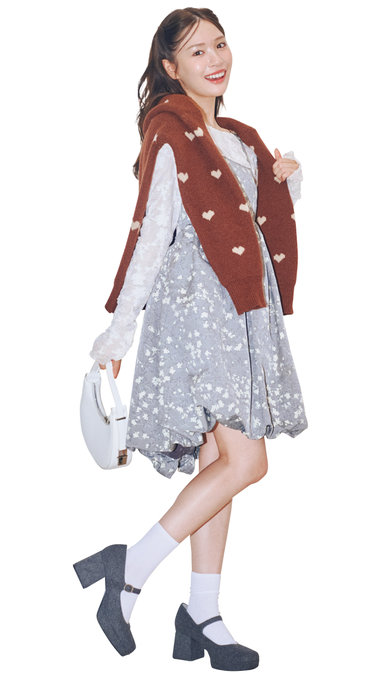 ハート柄ニットは着回し。ボディスーツ 15,400円/HONEY MI HONEY 花柄バルーンワンピース 22,000円/HONEY MI HONEY バッグ 3,280円/神戸レタス ソックス(3足セット)1,188円/チュチュアンナ パンプス 9,900円/チャールズ&キース(チャールズ&キース ジャパン)