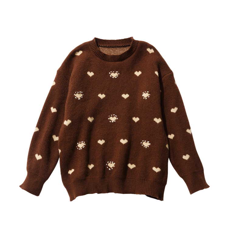 キュートなハート柄ニット。ガーリーなデザインも、ホワイトとブラウンの落ち着いた秋カラーなら、柄ボトムにもあわせやすい。