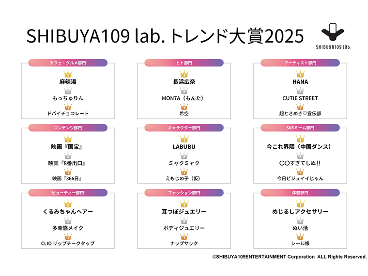 今年も「SHIBUYA109lab.トレンド大賞2025」を発表いたしました。アラウンド20(15~24歳)の女性619人を対象に実施したアンケート結果から、25年に若者の間で流行したものを発表しています。