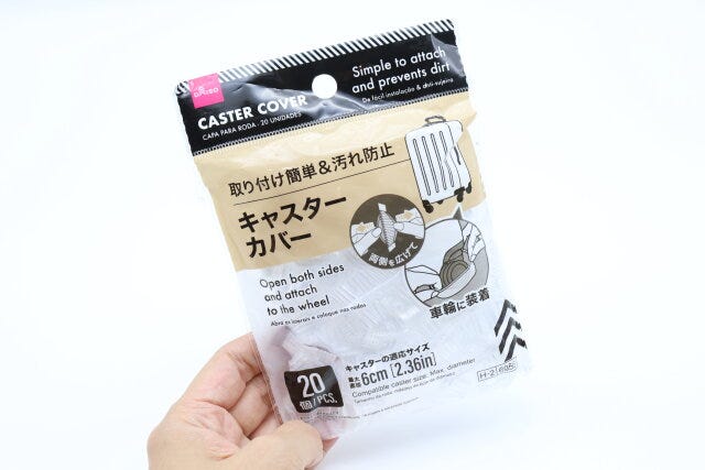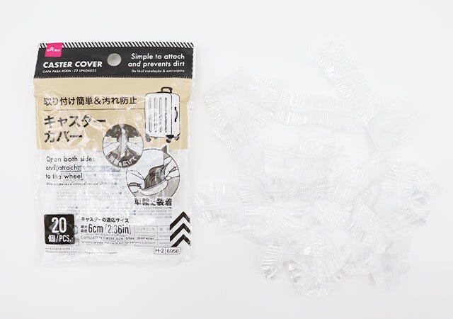 その名も『キャスターカバー(20個)』。お値段は20個入りで110円(税込)。基本的に4つ車輪がついていることを考えると、キャリーケース5つ分でこのお値段です。