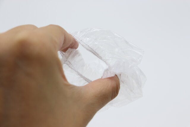 ビニール製で口の部分にゴムがついているシンプルな作り。耐久性はそこまで強くなさそうですが、保管するときに使ったり、室内に持ち込むときの汚れ防止に使う分には十分です。