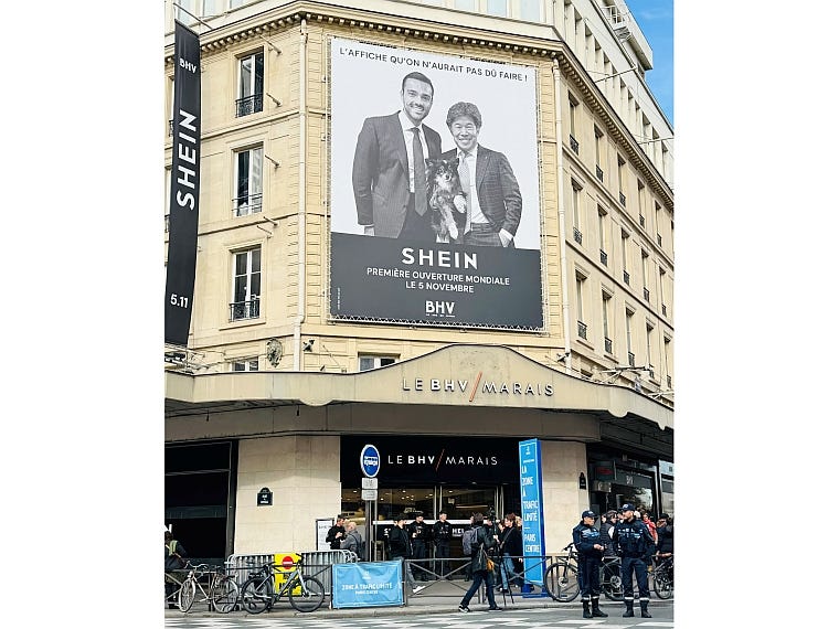 中国発のウルトラ・ファストファッション「シーイン」が、1856年創業の百貨店BHVマレに世界初の常設売り場(約1200平方メートル)を開設した。ファッションを主要産業とし、環境負荷や人権に法規制を進めるフランスでは、シーインの進出に対し政府、経済界、非政府団体らの反発が強まるなか、ECサイトでの違法商品の摘発が報じられた直後の開業となった。同売り場オープン前夜からBHVには警官が配備され、翌朝には機動隊が同店周辺を警備、一帯の道路が封鎖された。