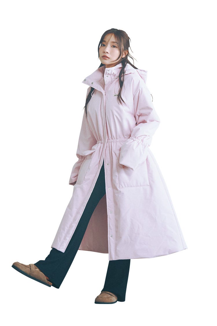 軽やかで美しいシルエットのロングパファーコート。ローファーあわせでエレガントな雰囲気を演出。