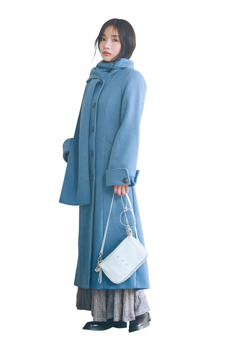 トレンド感満載のマフラーつきロングコート。マフラーはネックの後ろで巻いても、前で垂らしてもOKな優れもの。
