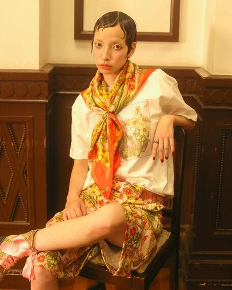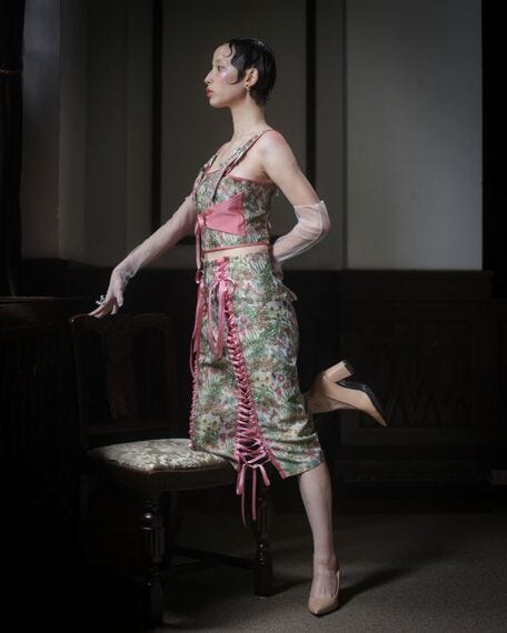 ムービーは、プレートに載ったケーキを食べる女性のシーンで始まった。その頭にはハエトリソウを模したボンネット。内部のつやつやした赤い粘液が虫をとらえる。食虫植物を繊細に表現したジャカードのビュスティエ風キャミソールに、ピンクのリボンのレースアップで体のラインを強調したタイトスカートを合わせて、フェティッシュな雰囲気。プリント柄のパフスリーブドレスは、ウエストの両サイドをカットアウト。ミニフリルで縁取り、ドローストリングできゅっと絞る。