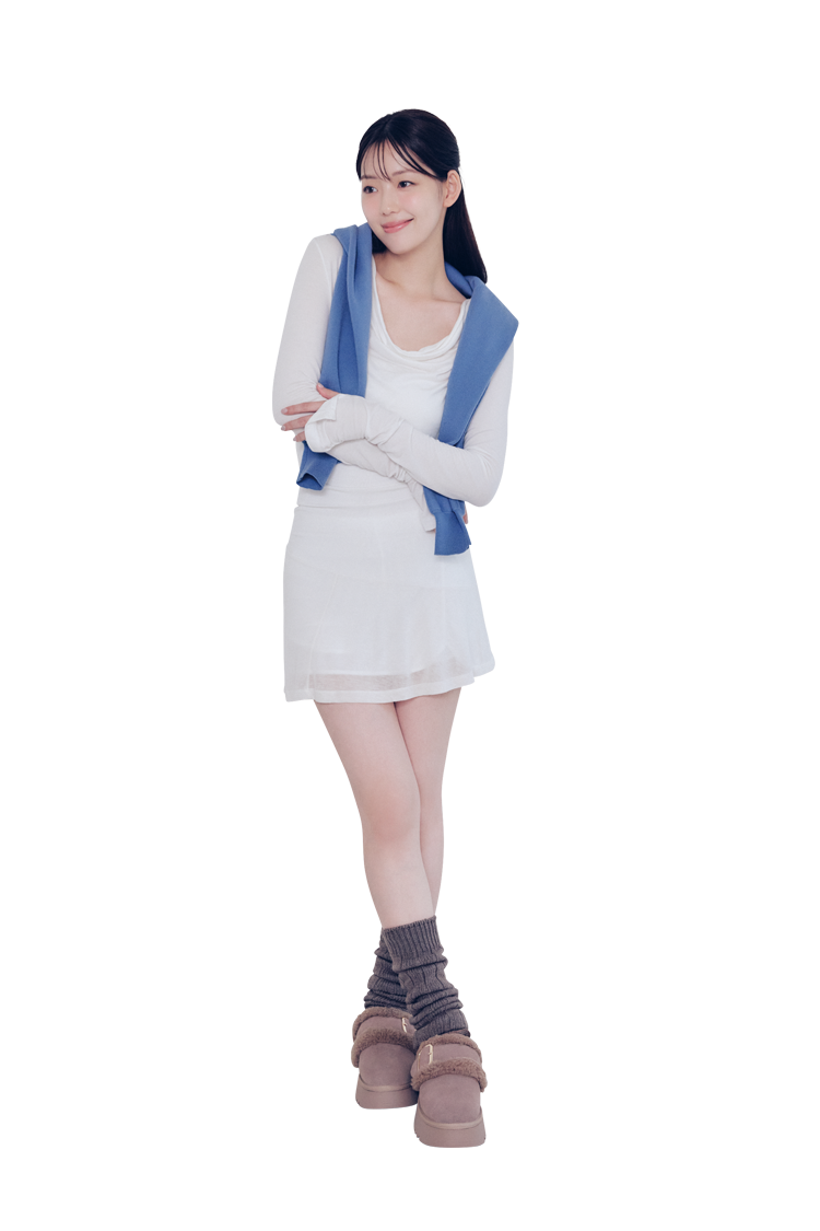 シンプルな深ネックは、背伸び感なく肌見せが叶う頼れるアイテム。ミニワンピで女のコらしさも取り入れながら、ラフさを生かすカジュアルな足元で全体のバランスを維持。