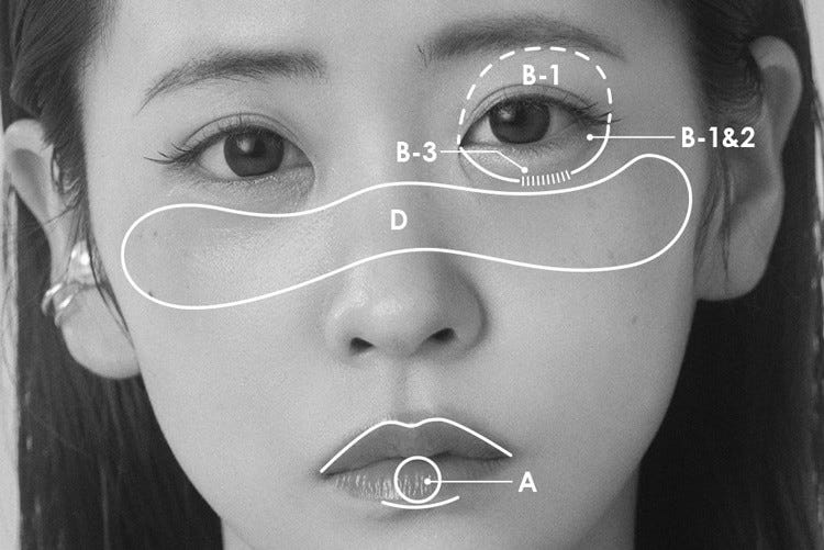 で上まぶたのきわにラインを引いて目尻は2mm延長。How to