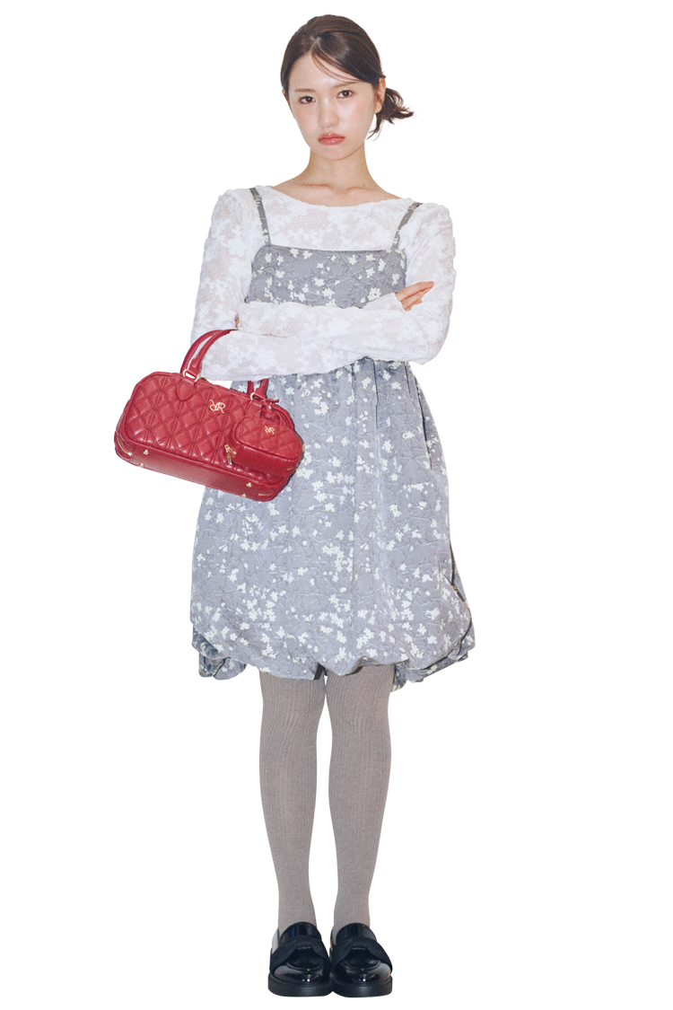 レースのボディスーツに花柄ワンピをあわせることで甘めな印象に♡ バッグを目を惹く鮮やかな赤にすることで、コーデのアクセントになる。