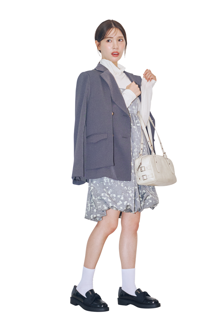 花柄バルーンワンピースは着回し。ボディスーツ 15,400円/HONEY MI HONEY バッグ 14,960円/RANDA タイツ 2,640円/靴下屋(Tabio)ローファー 13,200円/アルテミス(アルテミス by ダイアナ アーバンドック ららぽーと豊洲店)