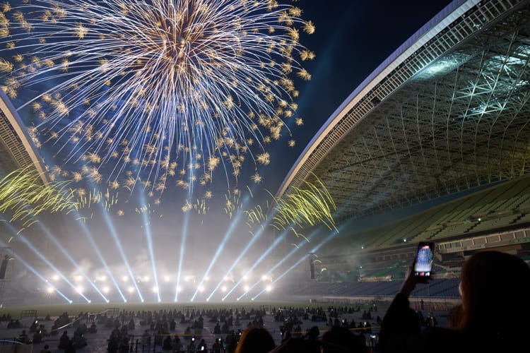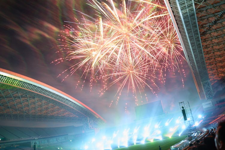など、アップテンポなセクションが続き、左から右、下からと観客がいないエリアの場内スタンドからも花火が打ち上げられ、至近距離からも存分に迫力を感じることができました。