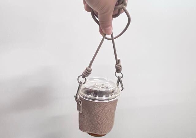 本来ドリンクカップは手に持つ必要がありますが、これなら紐で持って運べるので、ほかの荷物とも一緒に持ち歩くことができます。