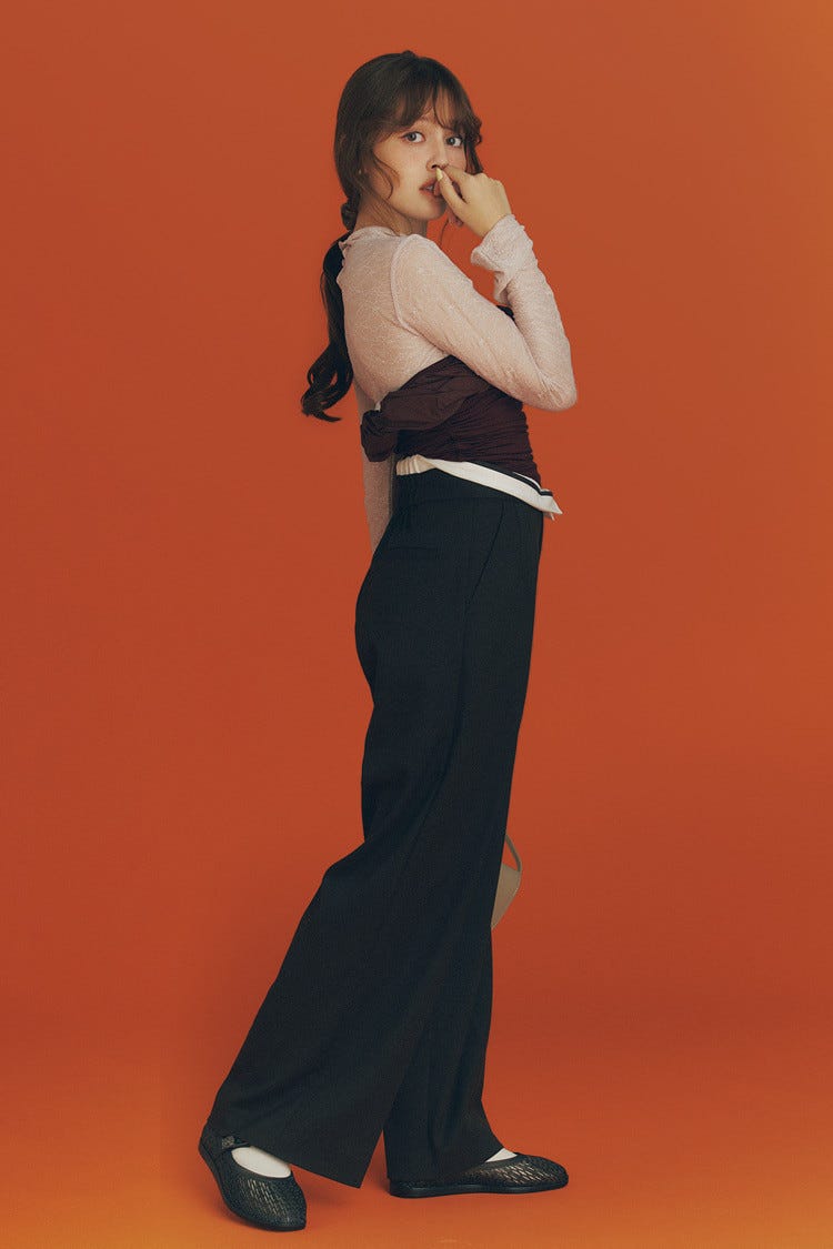 ほどよく肌が透ける柔らかい風あいのレイヤードトップスに、スタイルアップ効果が期待できるパンツのあわせがお上品。