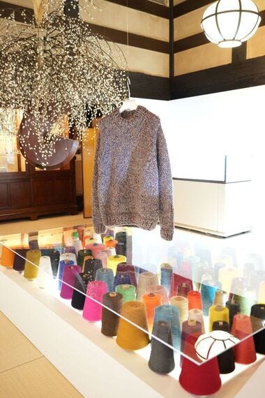 特別展を開いた経緯は、岡崎博之社長がイタリアのニットメーカーの周年記念パーティーに参加した時、取引先ブランドの展示があり感銘を受け、自社の周年でも取り入れたいと思ったため。岡崎社長は「4代目が入社し、次世代のスタッフも育ってきている。これからの丸安毛糸を伝えたかった」と話す。