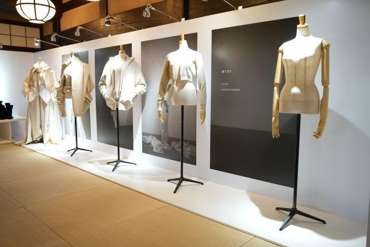 協業デザイナー・アーティストは、「シュタイン」の浅川喜一朗氏や「ヨーク」の寺田典夫氏、「ニットポッテリー」のサトウエミコ氏、プロダクトデザイナーの中村暖氏、台湾から「ジャスティンXX」の周裕穎氏、野流着装奥伝講師・民族衣裳文化普及協会指導師範の洪宇辰氏。シュタインとヨークは、26年1月のパリ・ファッションウィークで発表予定のアイテムやトワルを特別に展示した。
