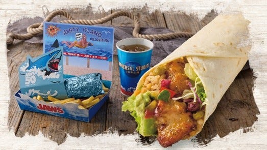 「バーベキューポーク・ブリトーセット」 造船所をモチーフにした「アミティ・ランディング・レストラン」では、ブリトーメニューをメインにフルリニューアル! スペシャル・メニュー「スパイシーシュリンプ・ブリトーセット」をはじめ、チキン&アボカド、バーベキューポーク、チリコンカンビーンズと、ボリューム満点で食べ応え抜群のブリトーがそろいます。映画公開50周年を記念したスペシャルパッケージにも注目です。