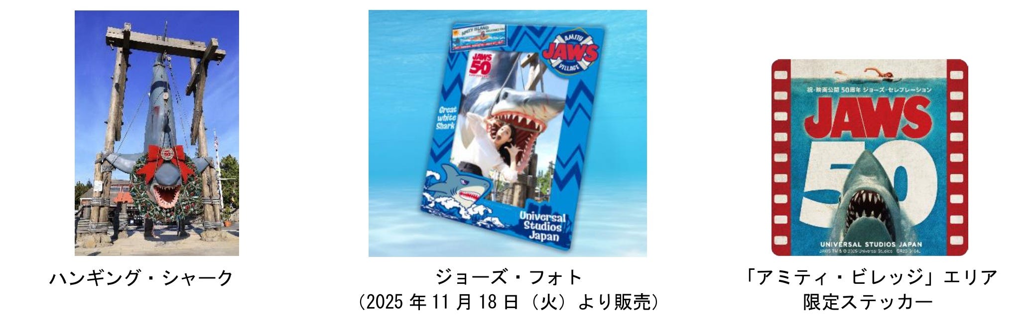 スティーヴン・スピルバーグ監督による不朽の名作『ジョーズ』が、今年日本公開50周年を迎えます。これを記念し、「アミティ・ビレッジ」の象徴である“ハンキング・シャーク”には、50周年限定のクリスマスリースが登場。「ジョーズ・フォト」では、アニバーサリー仕様のフォトテンプレートで記念撮影ができます。