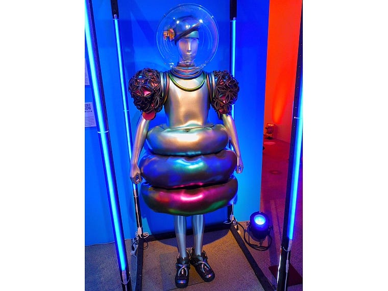 未来のファッションは、大阪の中小企業が協業して開発した繊維製品。見る角度によって色が七変化する「虹をかける服」、「折り鶴レーヨン」と化粧水成分を練り込んだ「モイストファイバー」を使った「希望の服」などを展示する。
