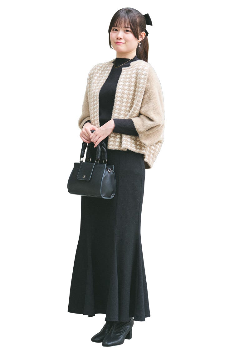 「淡いベージュの千鳥格子柄ニットカーディガンはTRUBEで購入。カッコよく見せたいのでなかのコーデは黒で統一。