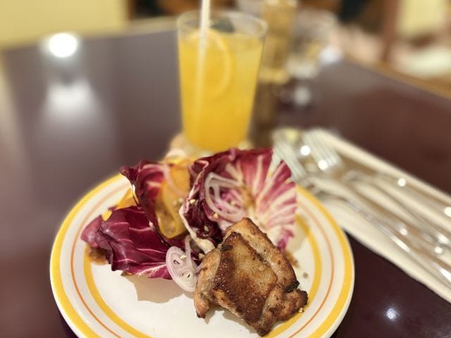 「グリルドチキンサラダ - ラディッキオ、アンディーブ、柿、チャイニーズビネガードレッシング」は、皮まで香ばしく焼き上げたチキンが主役。中国の鎮江香醋を使った自家製ドレッシングが絶妙にマッチし、ビールや日本酒にも合う味わいです。