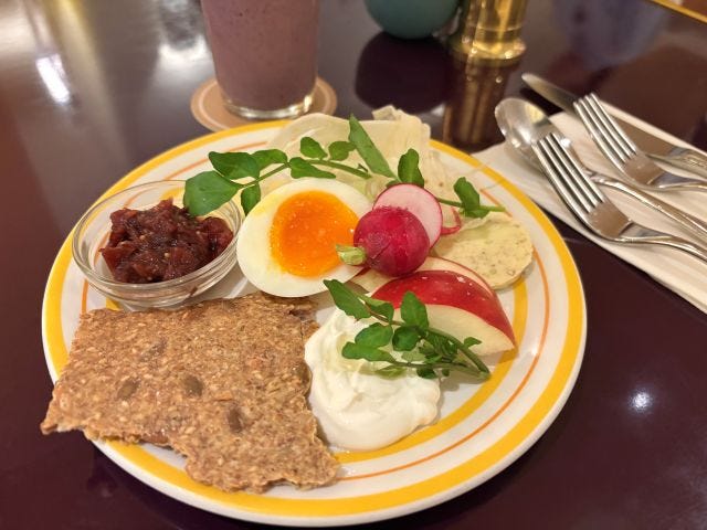 自家製「クリスプブレッド」に、酸味の効いた「プラムアップルレリッシュ」や「そばの実バター」を合わせていただきます。フレッシュな野菜とフルーツ、岡山県蒜山の「ジャージーゴーダ」など、食材の彩りが一皿にぎゅっと詰まった、気分の上がるメニューです。