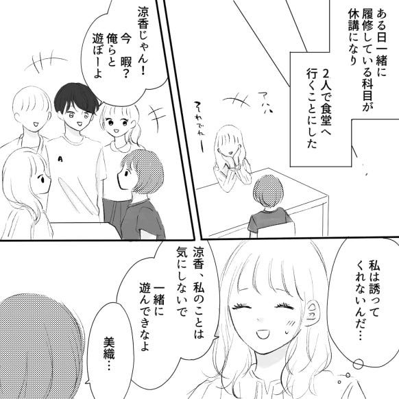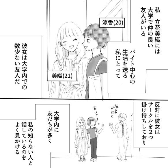 バイト中心で忙しい生活を送る主人公には、涼香という仲のいい友だちがいます。彼女にとって涼香は大学内でも数少ない大切な友だちです。