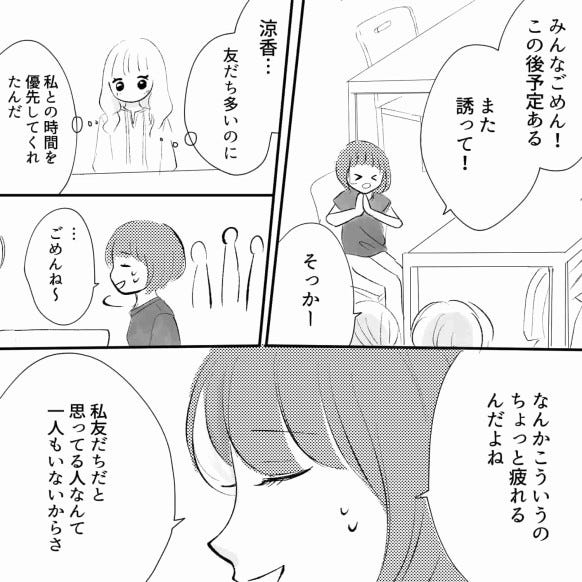 一番の友だちだと思っていた涼香に「友だちだと思っている人なんて、ひとりもいない」と衝撃的なひと言を言われ、ショックで立ち去ってしまった主人公。