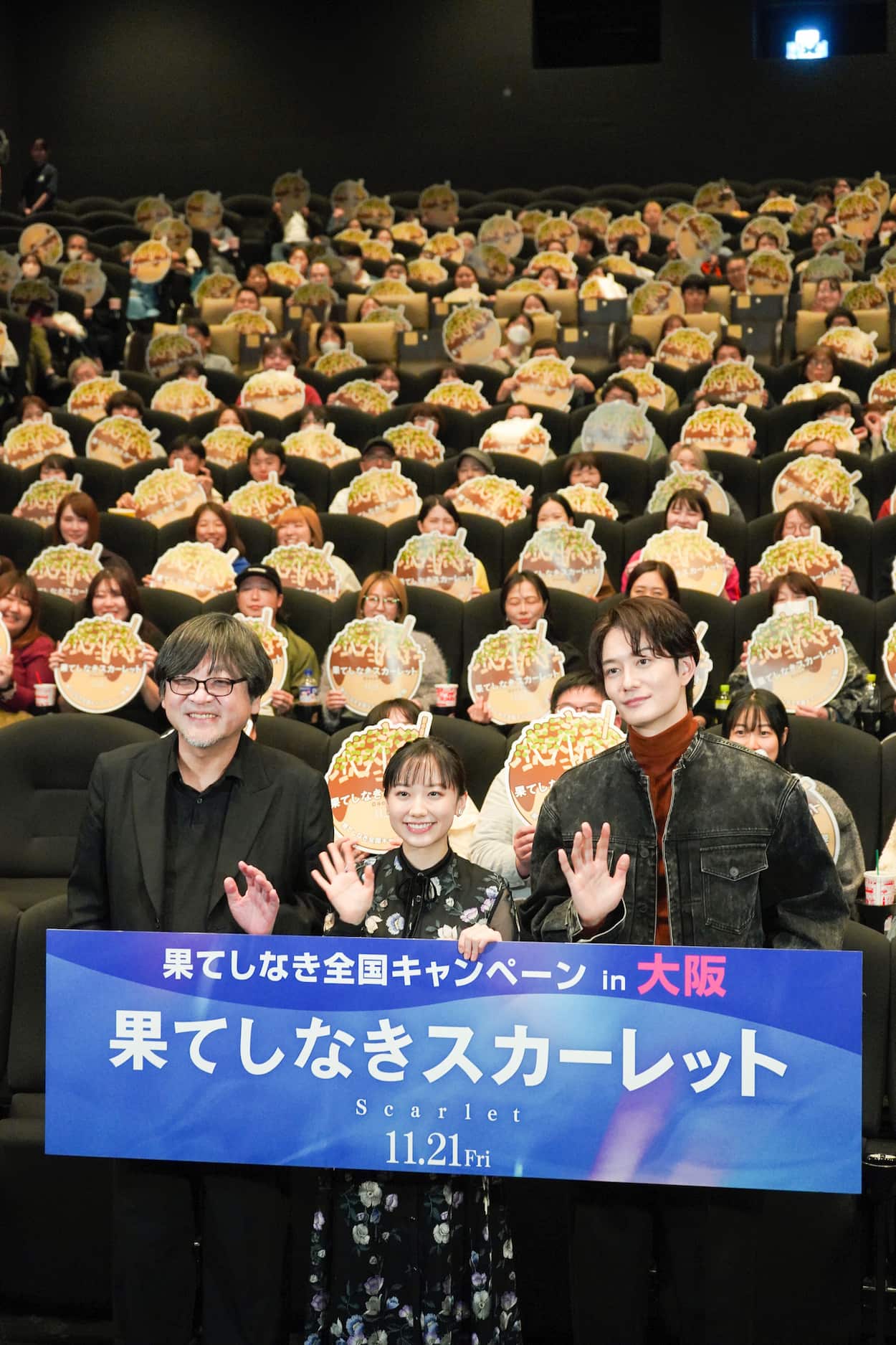 アニメーション監督、細田守率いる「スタジオ地図」から、アニメ映画『竜とそばかすの姫』以来4年ぶりとなる待望の新作映画『果てしなきスカーレット』が 2025年11月21日(金)に公開。先日、全国キャンペーンの舞台あいさつが大阪市内で行われ、主人公のスカーレットを演じた芦田愛菜、スカーレットと旅を共にする聖(ひじり)役の岡田将生、監督の細田守が登壇。本作への思いや大阪の印象などのトークを展開した舞台あいさつをお届けします。