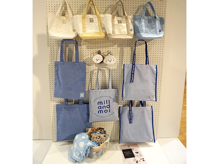 ミルアンドモイもアパレルを販売する。ウサギはピンクを軸にし、中高生向けにバッグやキャップを作る。犬はサックスカラーが中心の20代向け。ポーチやヘアアクセサリーのほか、ルームウェアを企画する。GMS(総合小売業)向けにトータル提案していく。