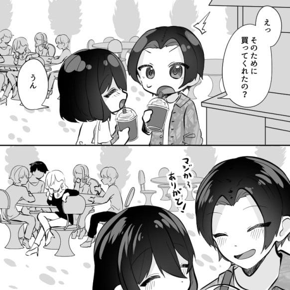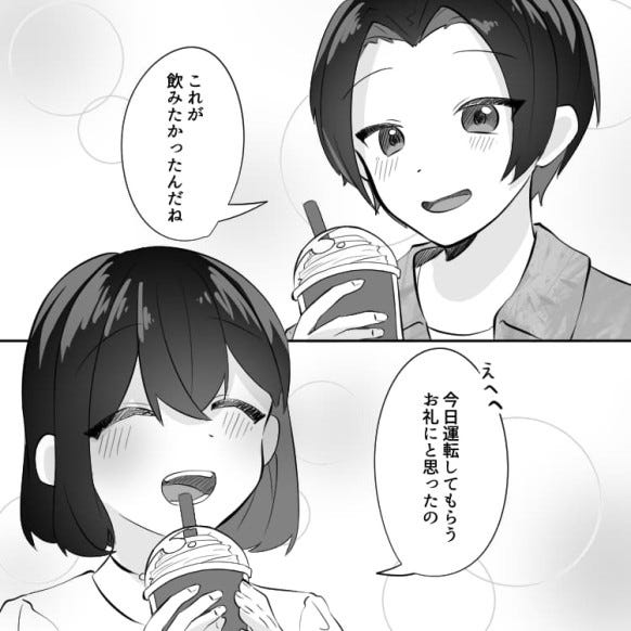 楓は運転してくれる亮太へのお礼に飲み物を買いました。