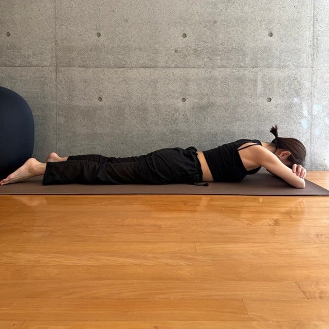 【01】冷えない場所にうつ伏せになり、肩の前方で肘を組んでおでこを乗せる。首の後ろが伸びるように肩を少し上げ、腰を左右に揺らしてお腹を床にあてながら深呼吸をする。