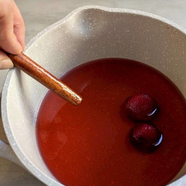 【02】小鍋に砂糖、いちご、シナモンを加え、ほんのりといちごが温まったらティーカップやホットグラスに注いで完成!