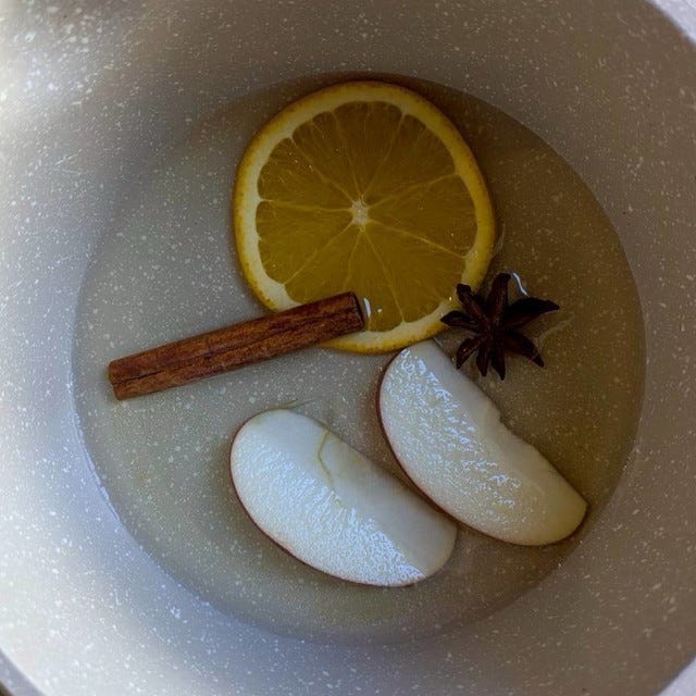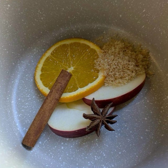 【01】小鍋にフルーツのスライスとお湯、砂糖、スパイス類を入れて中火にかける。
