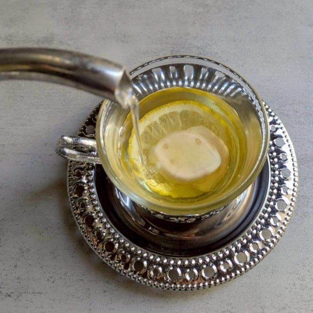 【01】温めたカップにレモンスライスと生姜スライスを入れ、はちみつ(お好みによって砂糖)を加える。