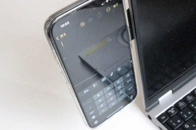 ノートPCの側面に粘着テープで固定し、MagSafe対応スマホや付属のメタルリングを使ってマグネットで装着可能です。視線移動が減るため仕事が捗る一方、粘着力が強く貼り付け跡が残る可能性があるので会社支給PCには注意が必要です。