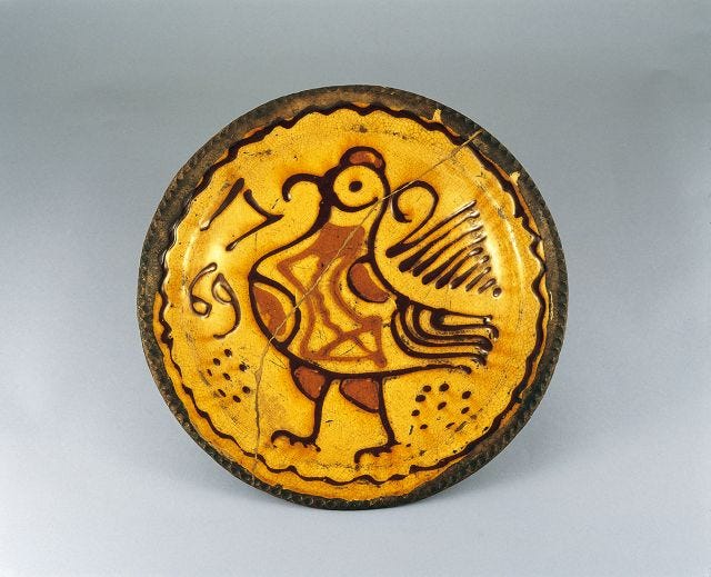 《イギリス スリップウェア鳥紋鉢》1769年(当館蔵) 2025年12月7日(日)までは、企画展「美術館で大航海! ~コレクションをたどって世界一周~」を開催中。美術館では、日本、朝鮮、中国、中近東、東欧、西欧、アメリカなどさまざまな時代と地域の作品を所蔵し、企画展では初出品作を含め100件を超える作品を一挙に公開します。