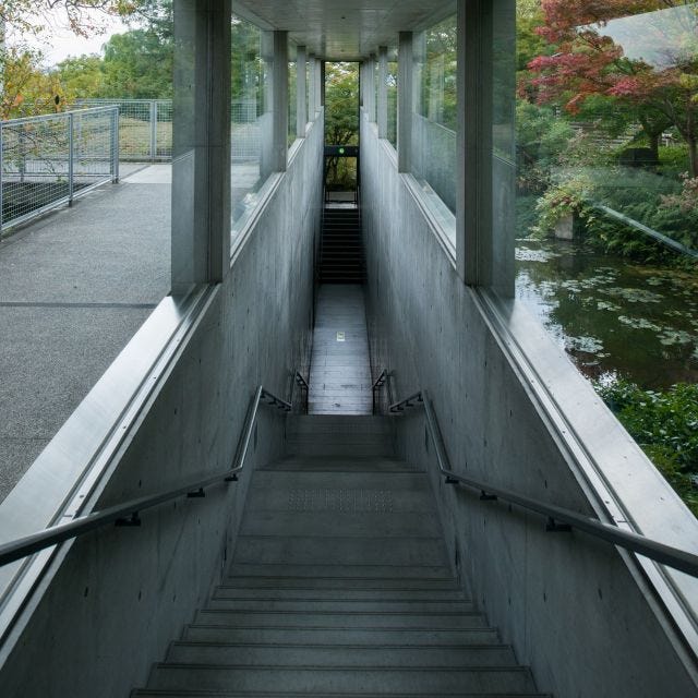 「地中の宝石箱」(地中館) 展示室に向かう階段 建築家・安藤忠雄氏が設計した展示室「地中の宝石箱」(地中館)では、クロード・モネ《睡蓮》連作を常設展示しています。