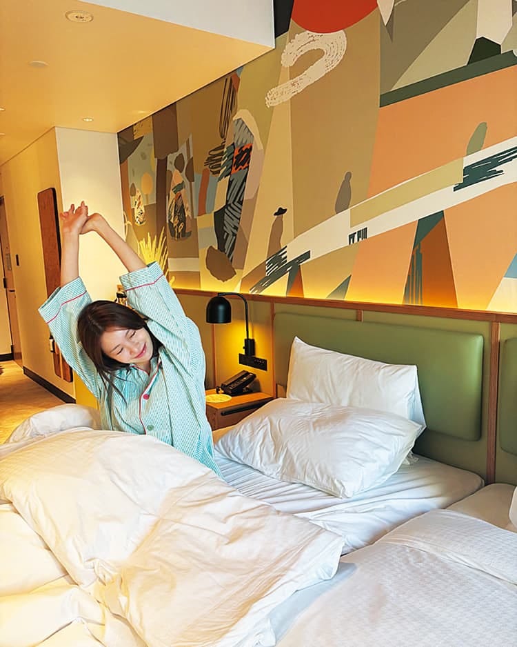 「客室のなかもアーティスティックで可愛い♡ パジャマもおしゃれで、友だちと来たら盛り上がりそう!ひとりでホテルで過ごすときはとにかく寝ることに徹するようにしてます(笑)」