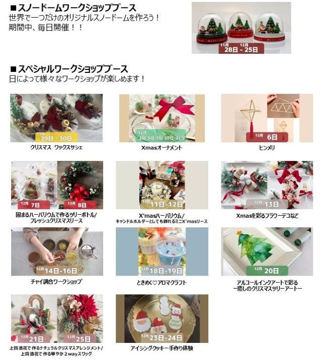 期間中、2つのブースでさまざまなワークショップが開催されます。世界でひとつだけのオリジナルスノードームや、アイシングクッキー手作り体験など、クリスマスがもっと楽しくなる体験ばかり。