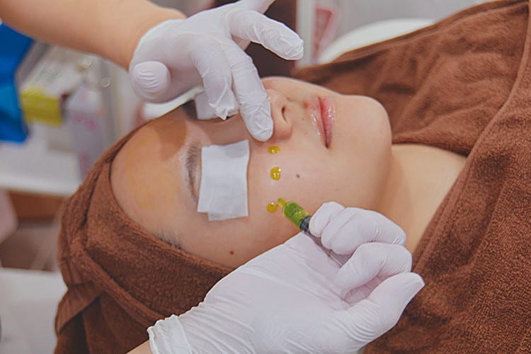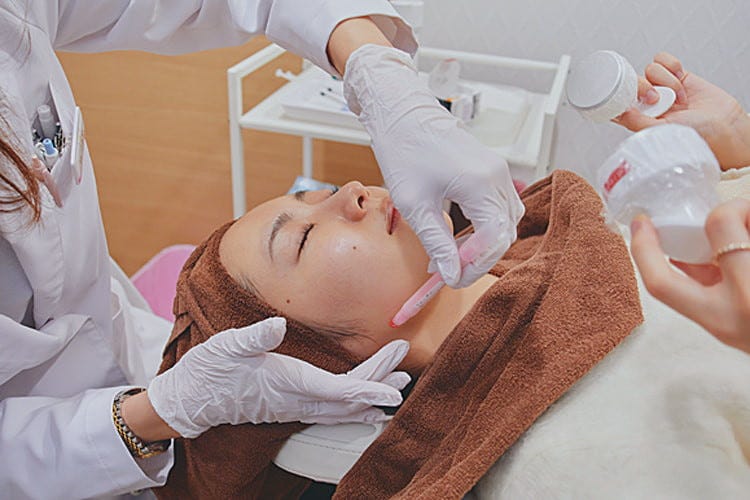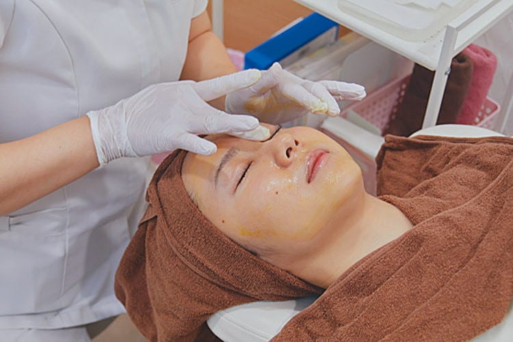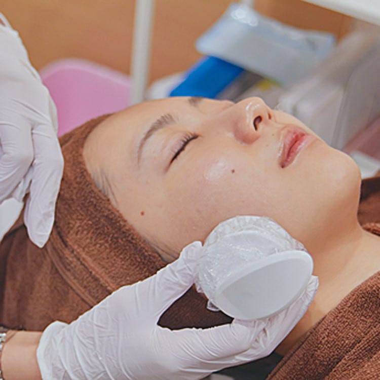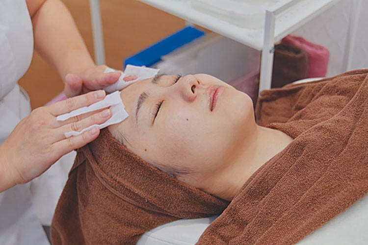 施術は看護師さんが担当。顔全体に薬剤をなじませたら約5分間放置し、成分を肌に浸透させます。その後、丁寧に薬剤を拭き取ってから保湿&冷やして、肌を鎮静させます。
