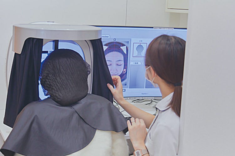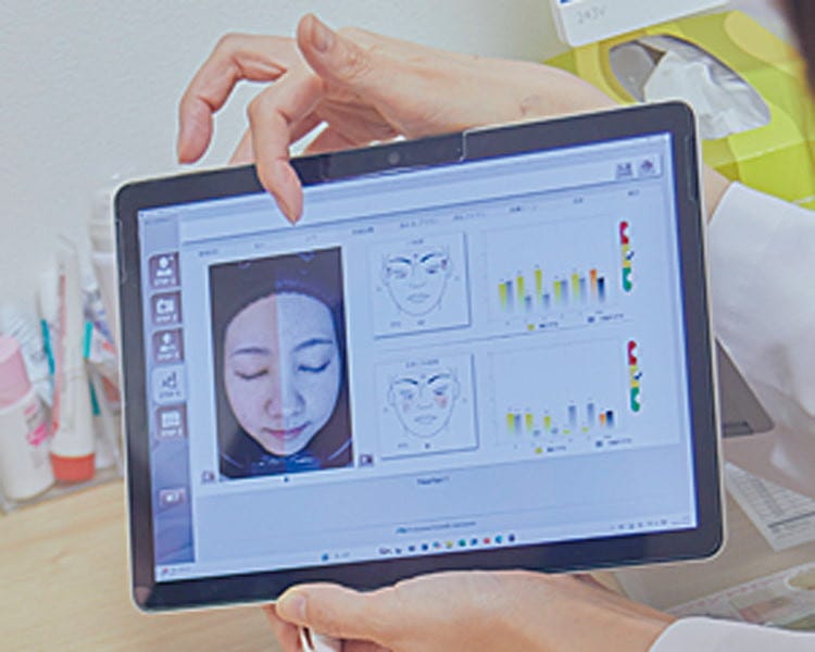 問診票を記入後、メイクをすべて落としてから肌診断を実施。高性能カメラと画像分析技術でシミやしわ、毛穴などの肌状態を詳しく解析する肌診断撮影をしていきます。