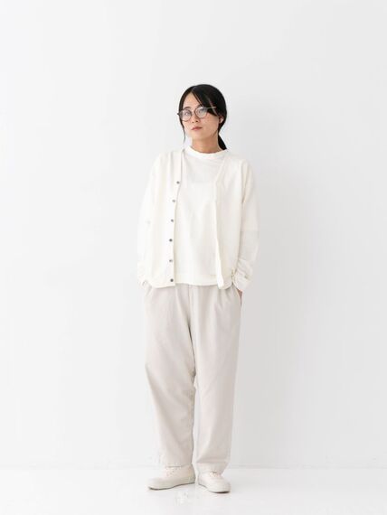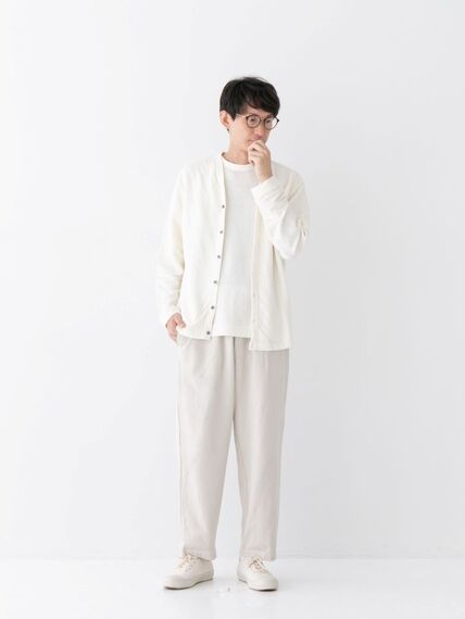 コーディネートに薦めるのは、スーピマコットンの裏毛パンツ。肌触りはもちろん、ウエストがゴム仕様など楽ではき心地が良い点に加え、シルエットにもこだわってカジュアルに見え過ぎないように仕上げる。4色展開で1万4000円。同素材でベストや裾がラウンド状になったクルーネック長袖プルオーバーもある。