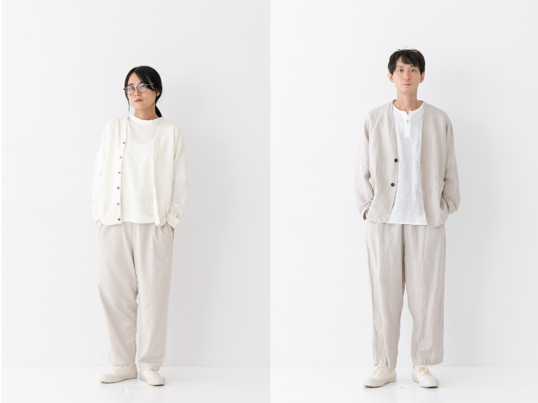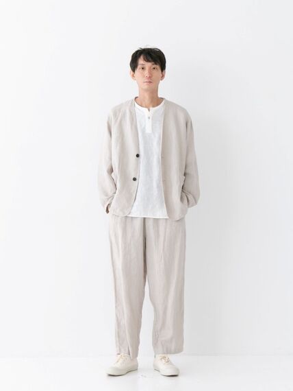 代表アイテムは、平織リネンのノーカラ―ジャケットとイージーパンツ。エアータンブラー加工でよりナチュラルな風合いにし、製品染めをして仕上げる。サンドベージュ、ネイビー、黒の3色を展開。ジャケット税抜き2万4000円、パンツが1万7000円。リネンのローンを使ったヘンリーネックシャツ(1万4000円)との組み合わせを推す。
