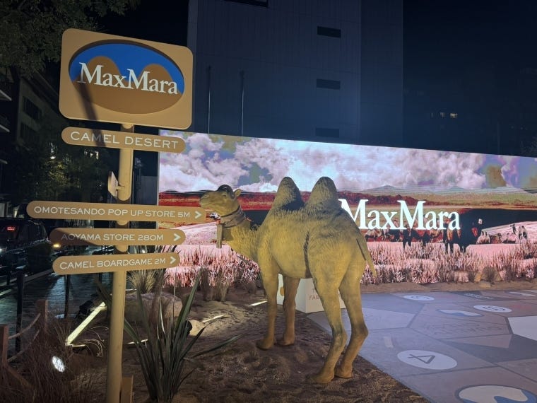 「マックスマーラ」は東京・表参道の交差点にあるイベントスペースで、ブランドを象徴するキャメルをテーマにした期間限定店「ザ・キャメル、タイムレス」を開いている。屋外には、フタコブラクダのオブジェが飾られている。11月30日まで。